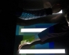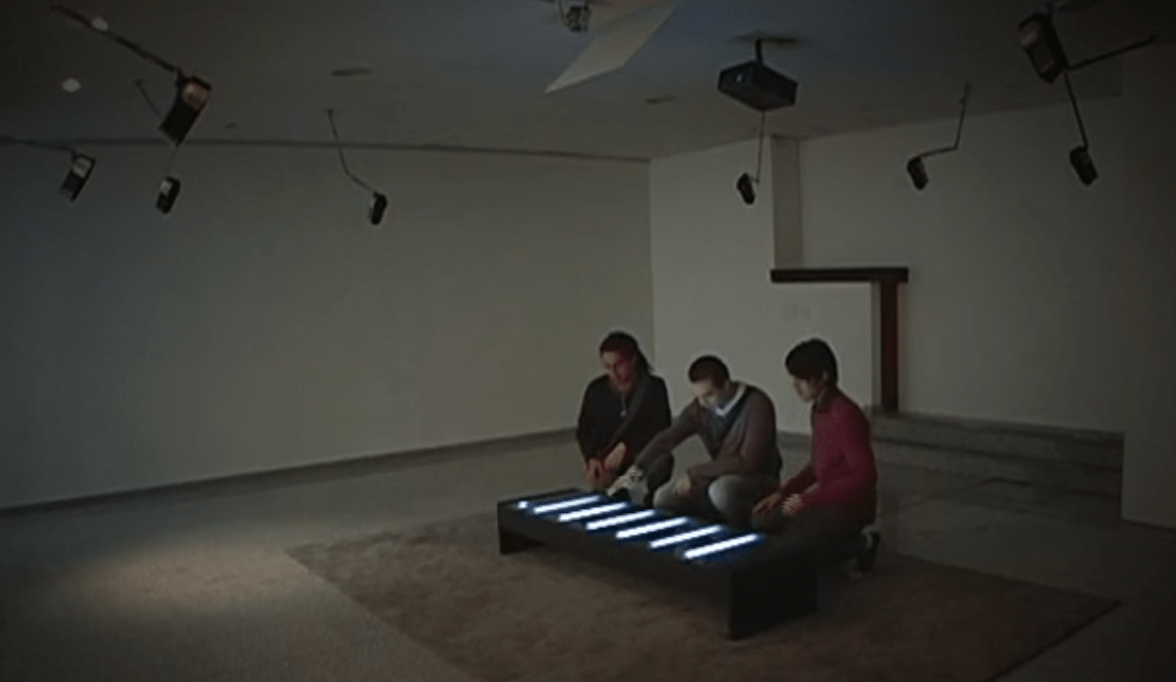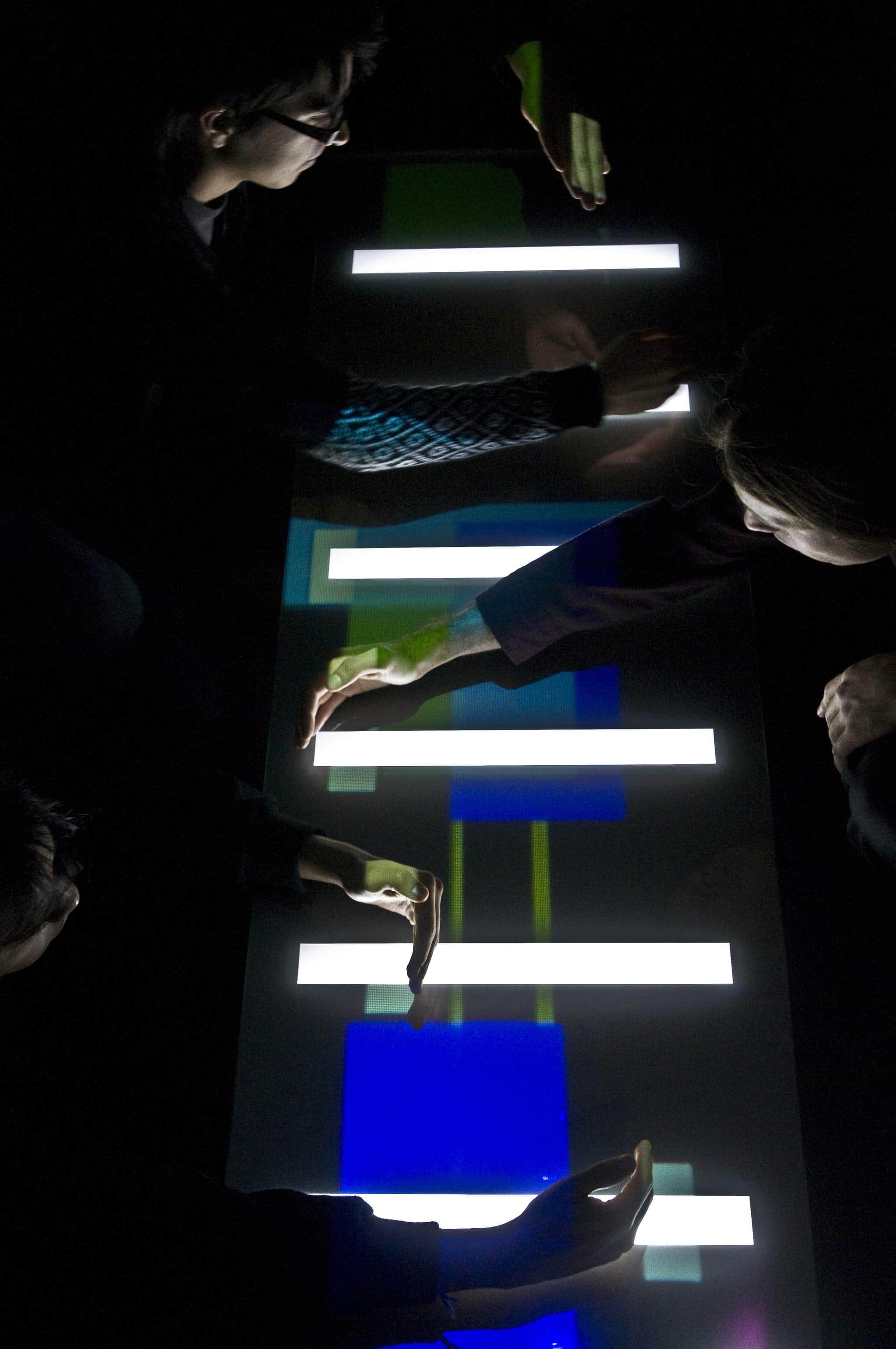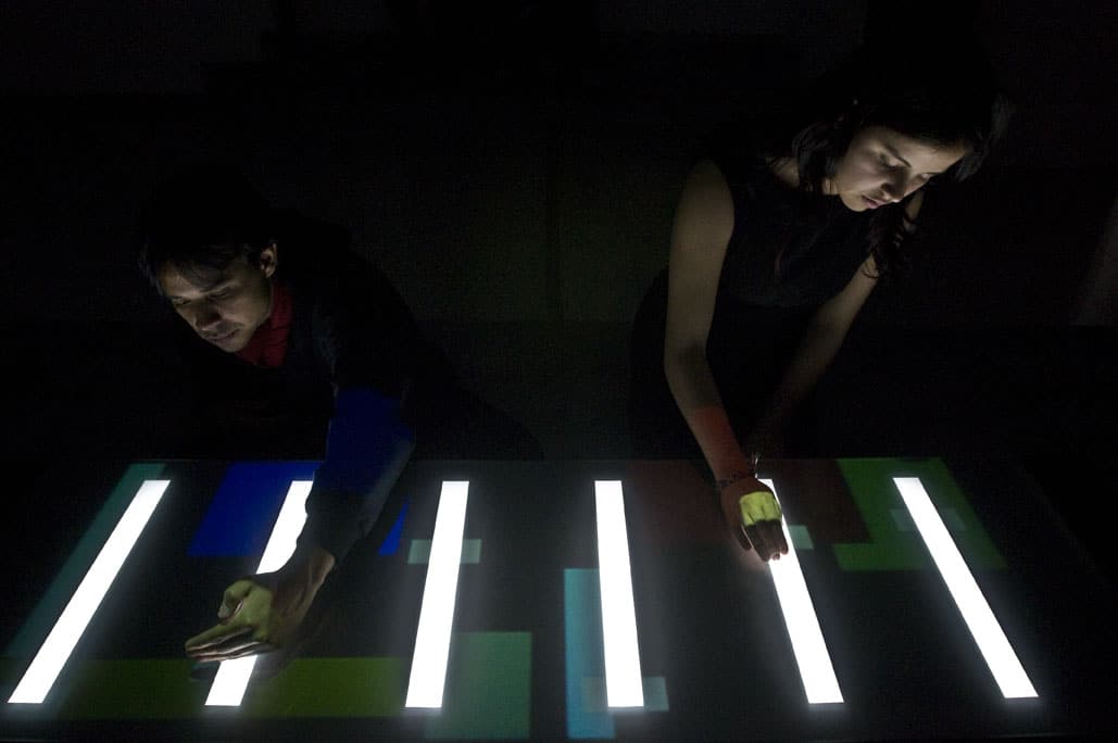 This interactive musical instrument is comprised of a luminous table, a real-time processing interface and nine speakers. Visitors slide the shadows of their hands over the luminous table to change the color and orchestral content of a musical piece by Alba Triana.