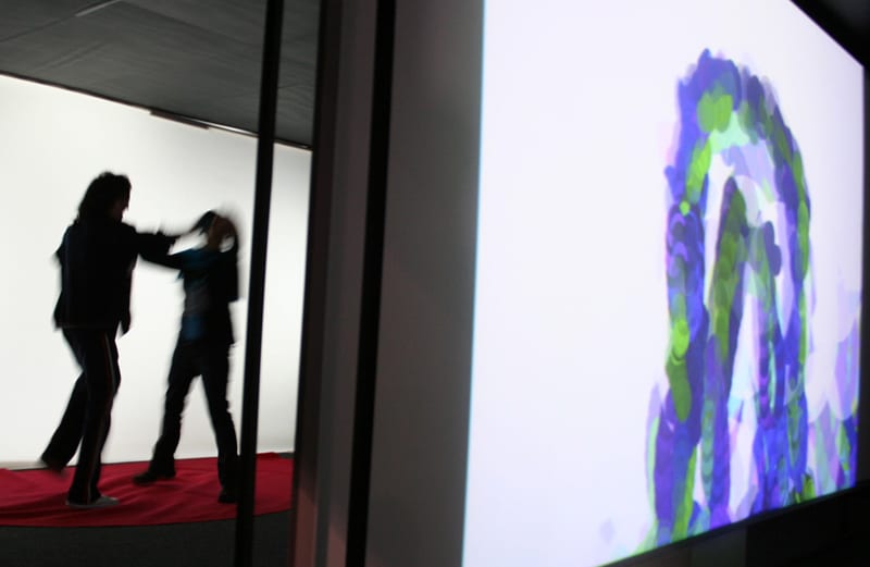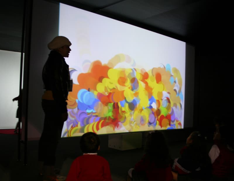 Description Desarrollo, por encargo, de la instalación interactiva para el pabellón infantil del festival internacional de arte de Bogotá – ArtBo 2010. En esta los niños crean sus propios performances, estimulados por una interfaz de partículas coloridas que reaccionan a sus gestos corporales.