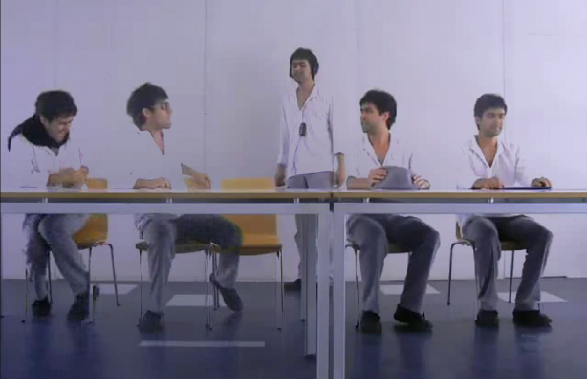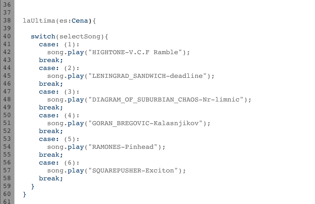 “LaUltima (es:cena)” is an algorithmic videographic work. 5 characters, each with its own timeline, make a series of asynchronous actions throughout the video.The narrative depends on the song you choose.