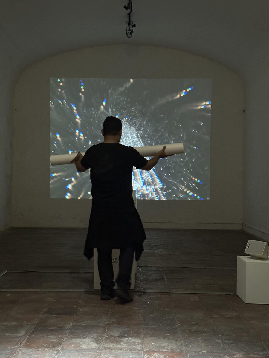 Momentum is an electronic, sonic, and visual instrument activated by the inertia of its movement when manipulated by a performer-user. This tubular object, of significant size and weight, is equipped with sensors and transmitters linked to a synthesis system that generates real-time audio and video signals based on the object’s movements during its interaction with the user. The immersive installation invites the audience to manipulate, dance, and engage in a dialogue with the sculptural object, generating spontaneous interpretations and creating what the author has termed an Openformance.