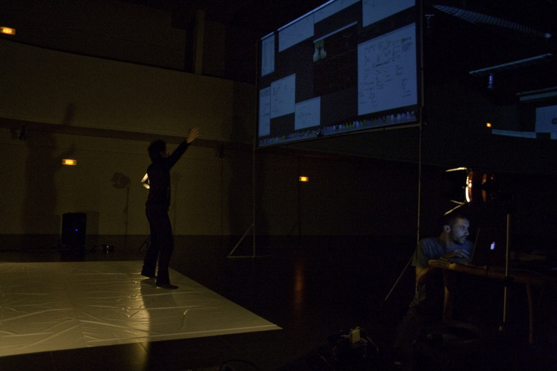 As a Performance Tool, a dancer/musician makes a sound composition with his movements. With postures and gestures he or she can control the system, creating a corporal language. After telling the machine what kind of sound is going to be used, the performer makes a gesture to start recording the movement. When the movement is finished, the performer stops, and immediatly the machine start to reproduce the composition in a looped way. Repeating this action the performer makes an entire concert. The complete video can be found below.