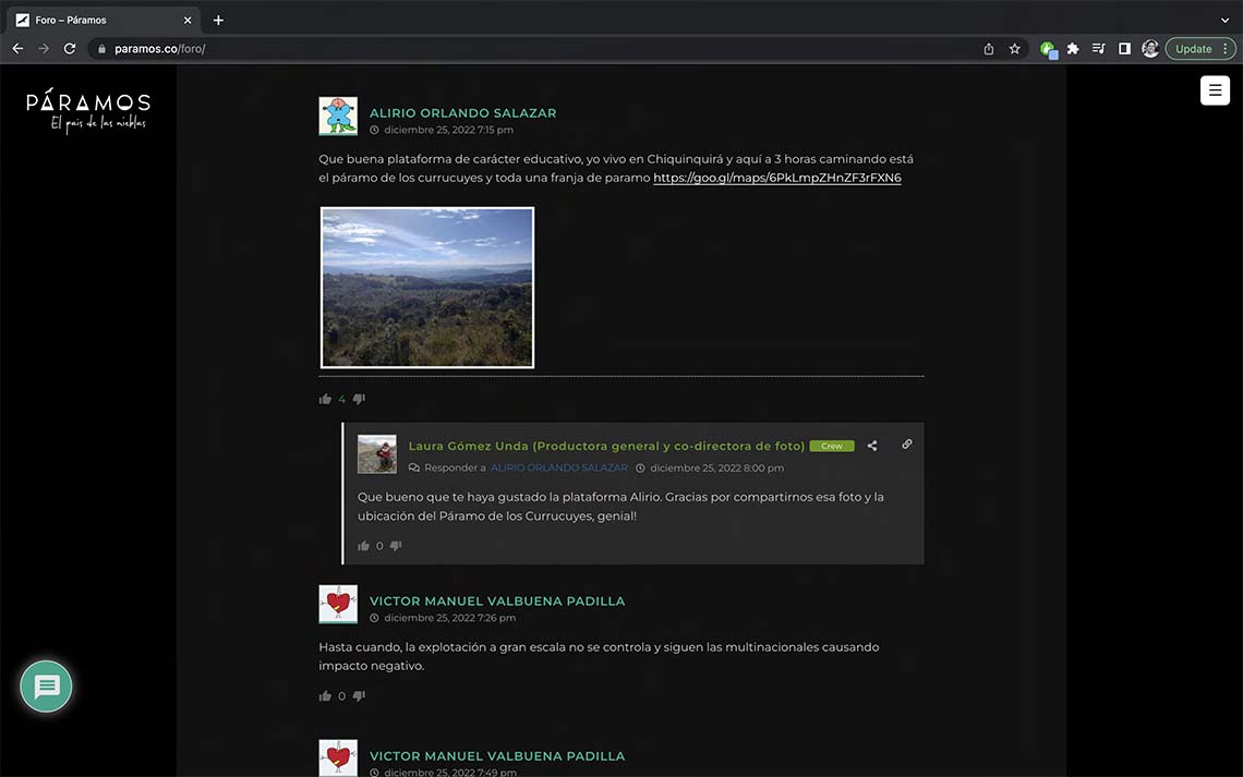 The transmedia platform provides users with a variety of ways to learn more about páramos. It includes interactive maps, audio recordings of interviews with experts, a blog, and a forum. The platform is designed to engage users in a deeper exploration of the film’s themes and to inspire them to take action to protect páramos.