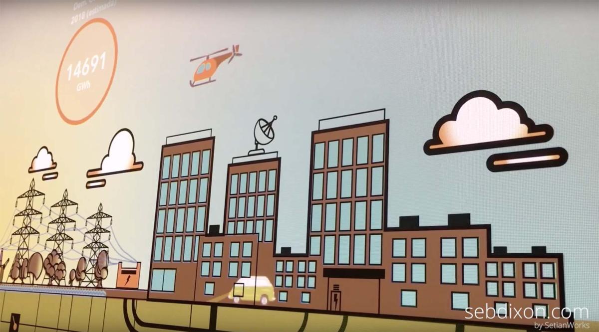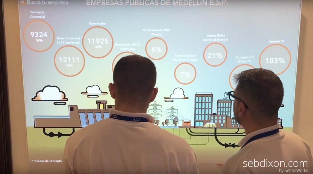The experience was developed to work on a printed wall with vector graphics that represents the production process of the energy generation, from the source to the consumer. The user was able to navigate inside a data base with all the information from the energy companies in Colombia.